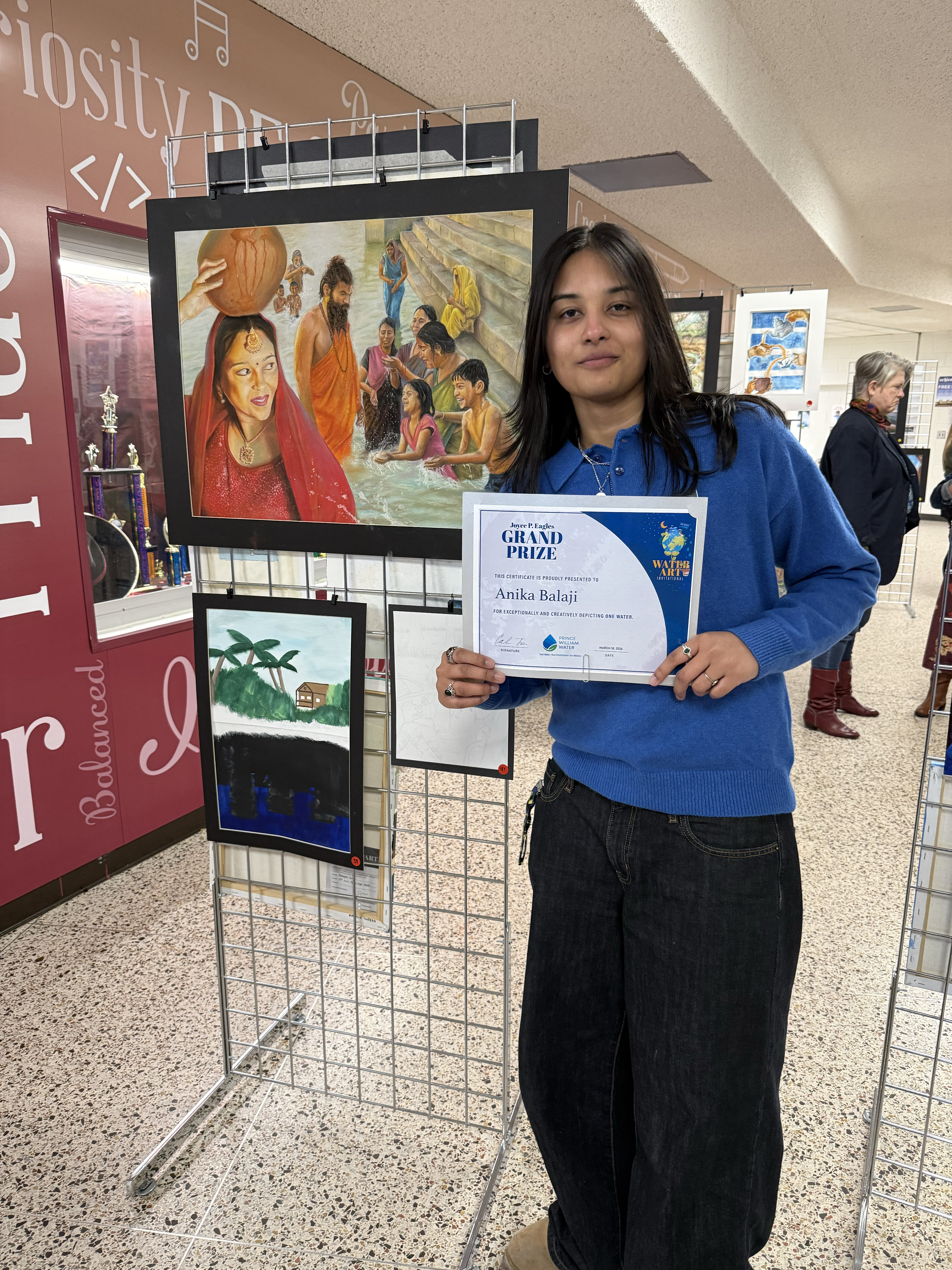 Anika Balaji of Colgan High School earned the Joyce P. Eagles Grand Prize for her vibrant depiction of the waters of India. Her family’s connection and deep cultural roots brought this exceptional piece to life in the eyes of the judges and ceremony attendees.